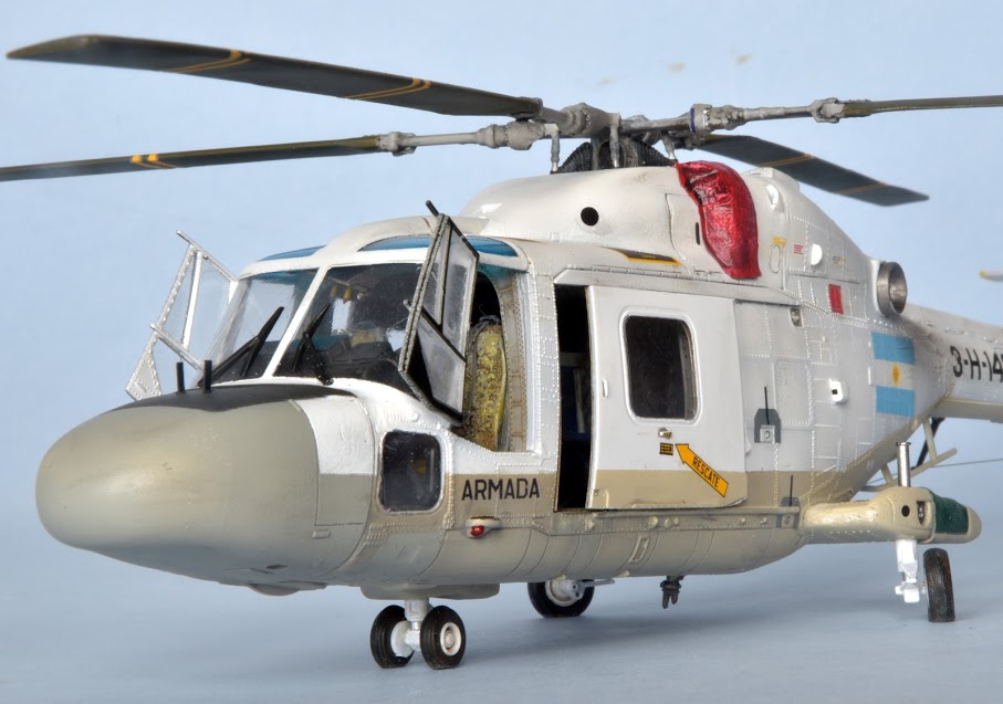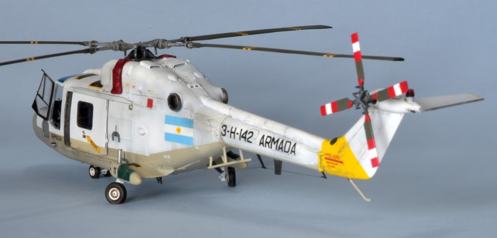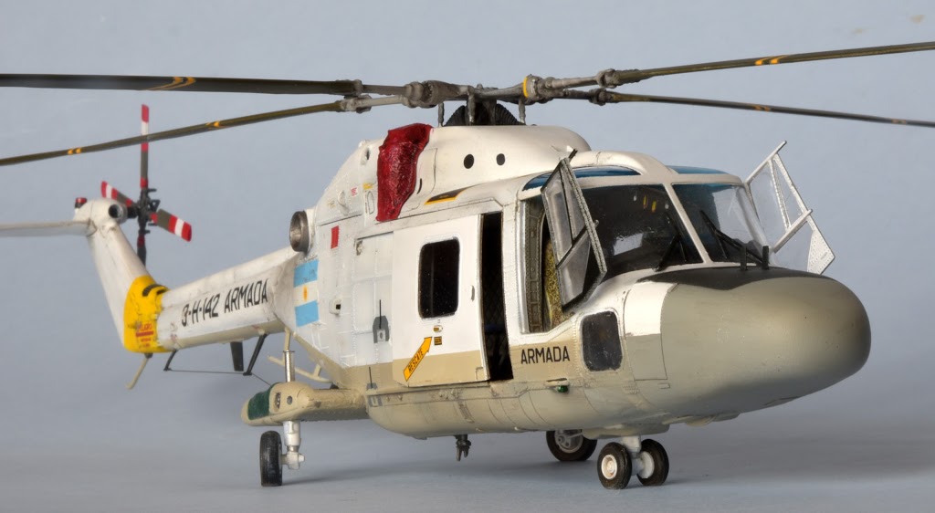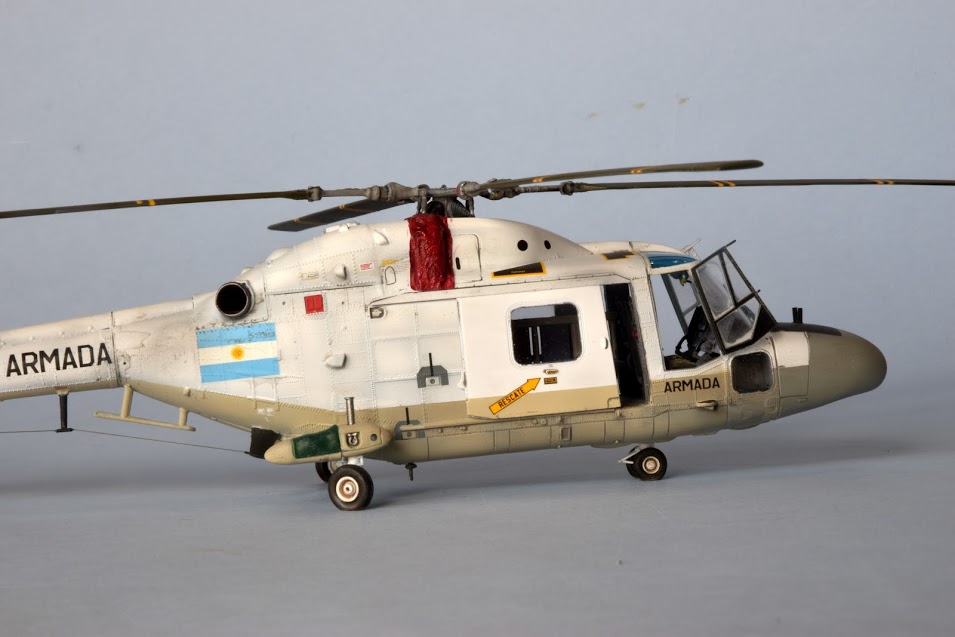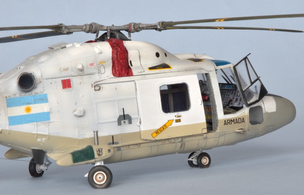 Here are some pics of my 1/48 Comando de Aviacion Naval Argentina Lynx Mk.23 completed a couple of months ago. This is Airfix’s HMA.8 with RotorCraft’s HAS.2/3 conversion applied. The conversion includes a new nose, rotor tips, decking over the rear of the engines and tailplane / gear box housing and tail rotor. With a few minor changes to the antennae this is about as close as I can get to one of the two Lynxes Argentina operated over the Falkland Islands during the 1982 conflict. References and information are few and far between, so there are a few assumptions in the cabin, which is fitted with the Eduard interior set.